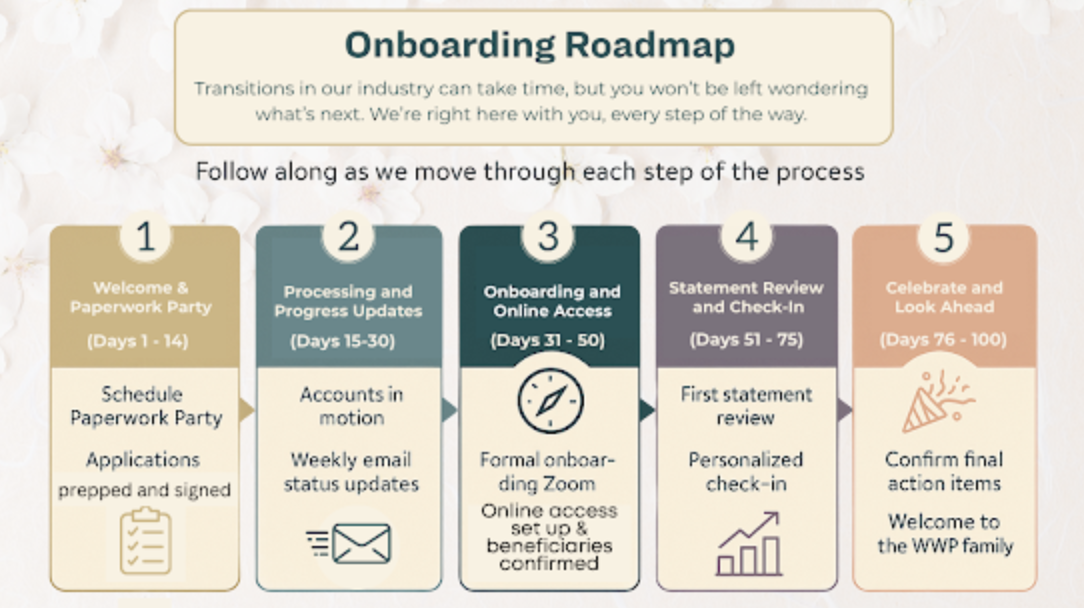 The First 100 Days is our complete onboarding process—a warm welcome to Wise Women Prosper. From the first conversation to the final onboarding session, you’ll feel valued, cared for, and confident that every detail is being handled. We keep you informed at every step, so nothing falls through the cracks. Most importantly, we walk beside you the whole way, making sure you never feel alone in the journey.